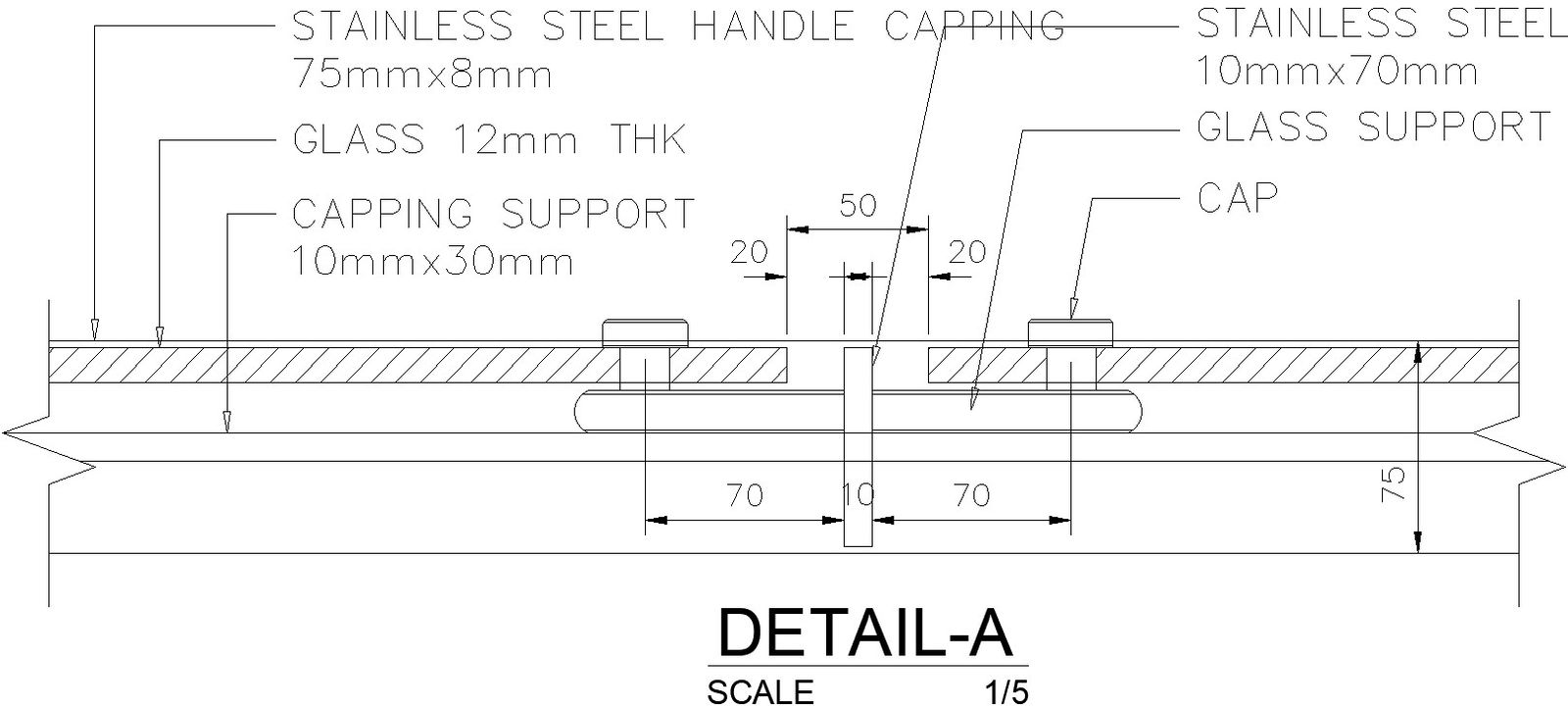 This architectural drawing is Structural member design with detail AutoCAD drawing. In this drawing there were stainless steel handle capping, glass support, cap, capping support, glass etc. are given with details. For more details and information download the drawing file.