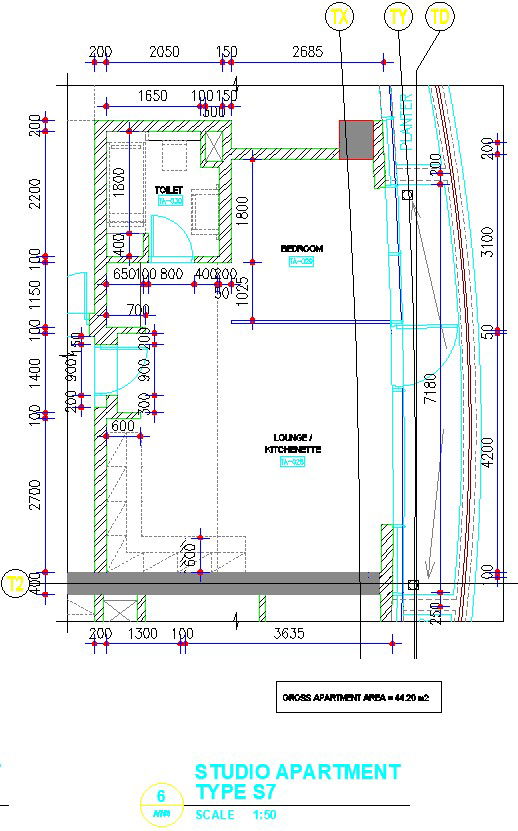This AutoCAD DWG file provides a detailed design of a studio-type apartment with a gross area of 44.20 sq.m. The plan features a spacious bedroom, an open living room combined with an attached kitchen, and a well-planned toilet. Ideal for architects, interior designers, and construction professionals, this CAD drawing ensures precise measurements and optimal space utilization for compact residential living solutions.