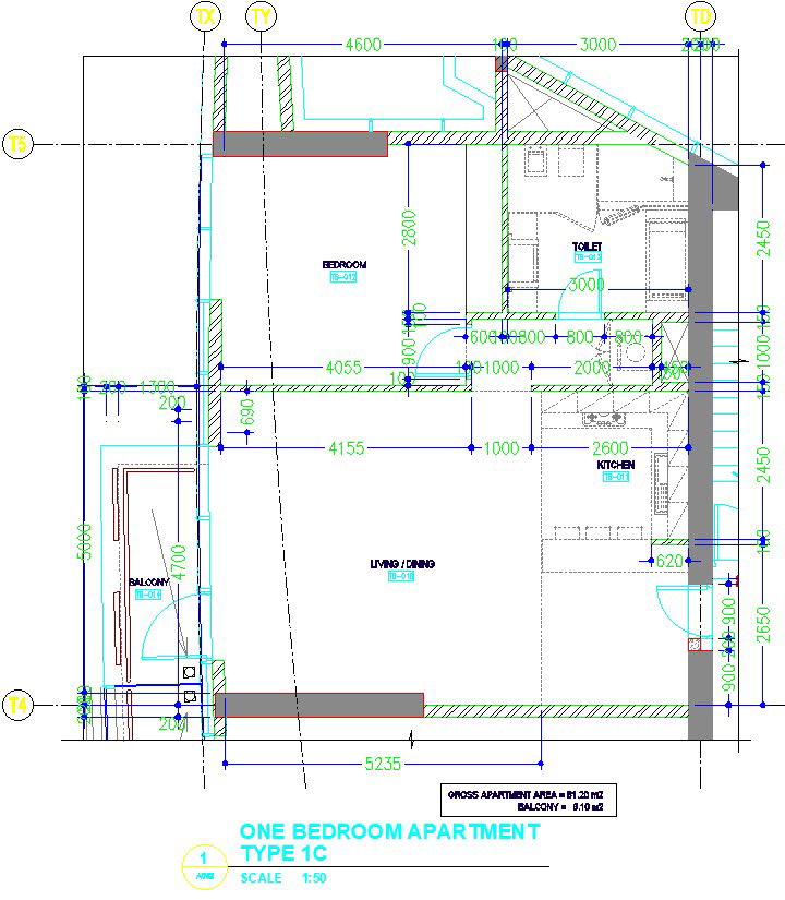 This architectural drawing is 1 BHK floor plan with detail AutoCAD drawing. In this drawing there were one bedroom, living room, dining room, kitchen, balcony etc. are given with details. For more details and information download the drawing file.