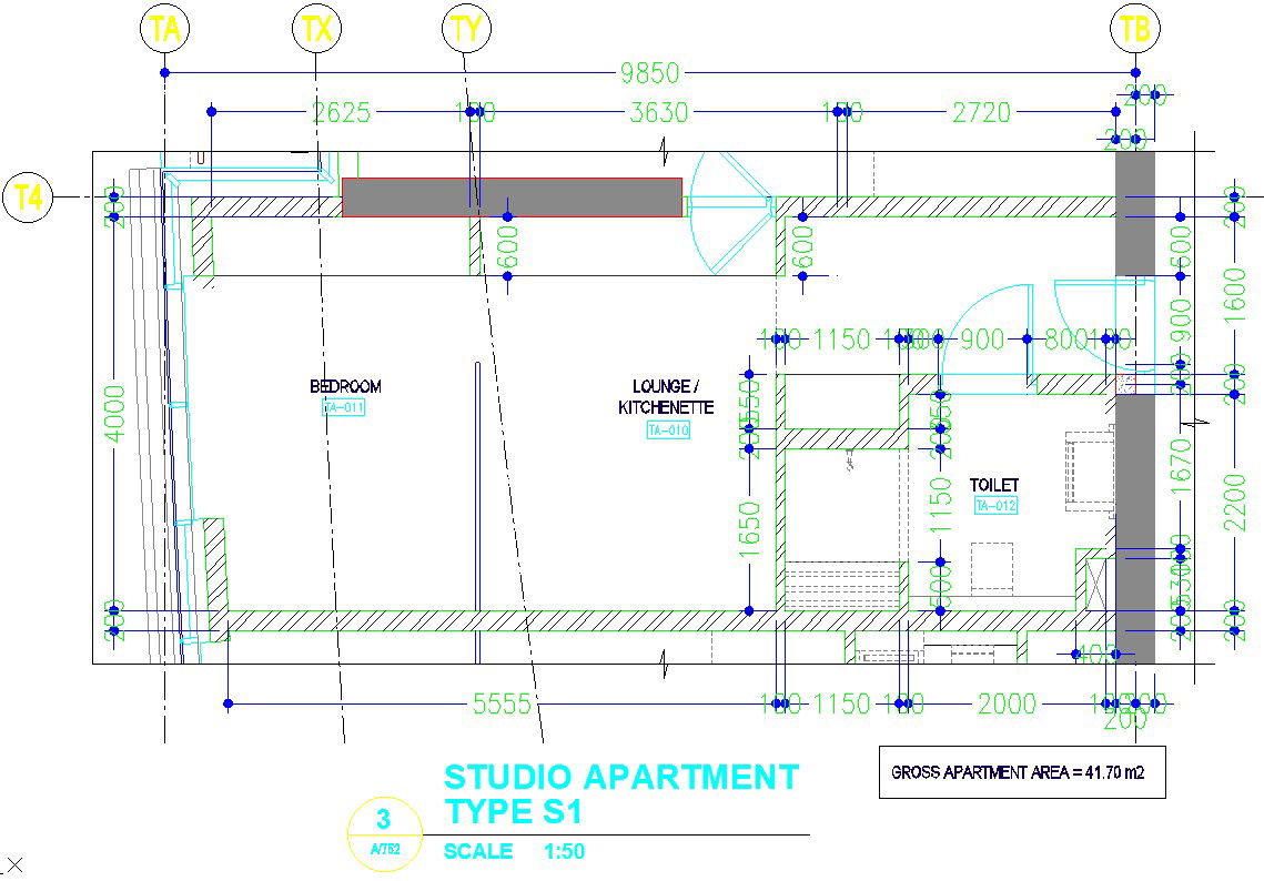 This architectural plan is Studio type apartment design with detail AutoCAD drawing. In this drawing there were gross apartment area is 41.70 sq.m. is given. There were toilet-bathroom, bedroom, living room attached with kitchen etc. are given with details. For more details and information download the drawing file.