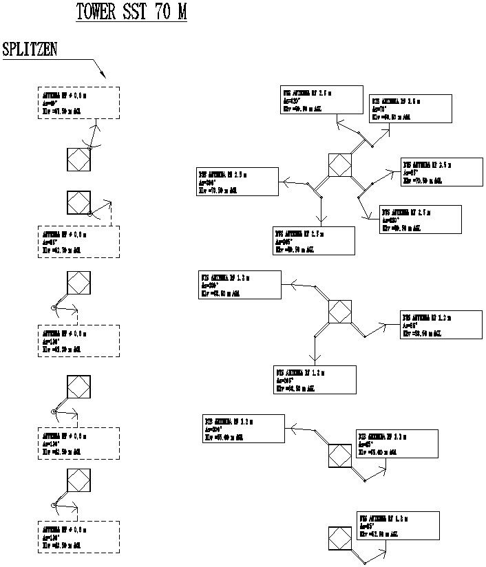 This architectural drawing is Detail drawing of antenna in AutoCAD 2D. In this drawing there were height of the tower is 70 meter given. There were different sections of antenna are given with details. For more details and information download the draiwng file.