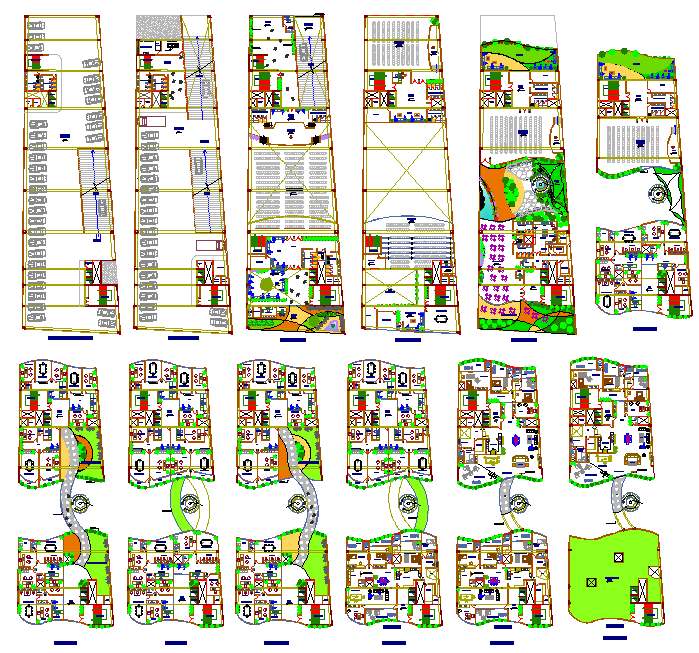 Business Center's architecture, sectional plan, structural plan of individual floor,floor plan, furniture layout, exterior landscaping.