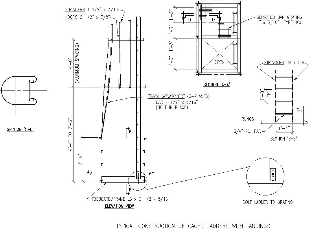 Typical construction of caged ladder with landings in detail AutoCAD drawing, dwg file, CAD file