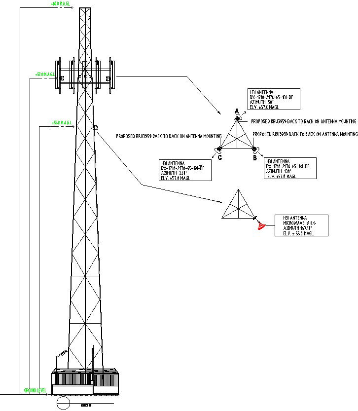 This architectural drawing is Detail drawing of back to back antenna mounting in AutoCAD 2D, CAD file, dwg file. In this drawing there were proposed RRU3959 back to back on antenna mounting is given with their details. For more details and information download the drawing file.