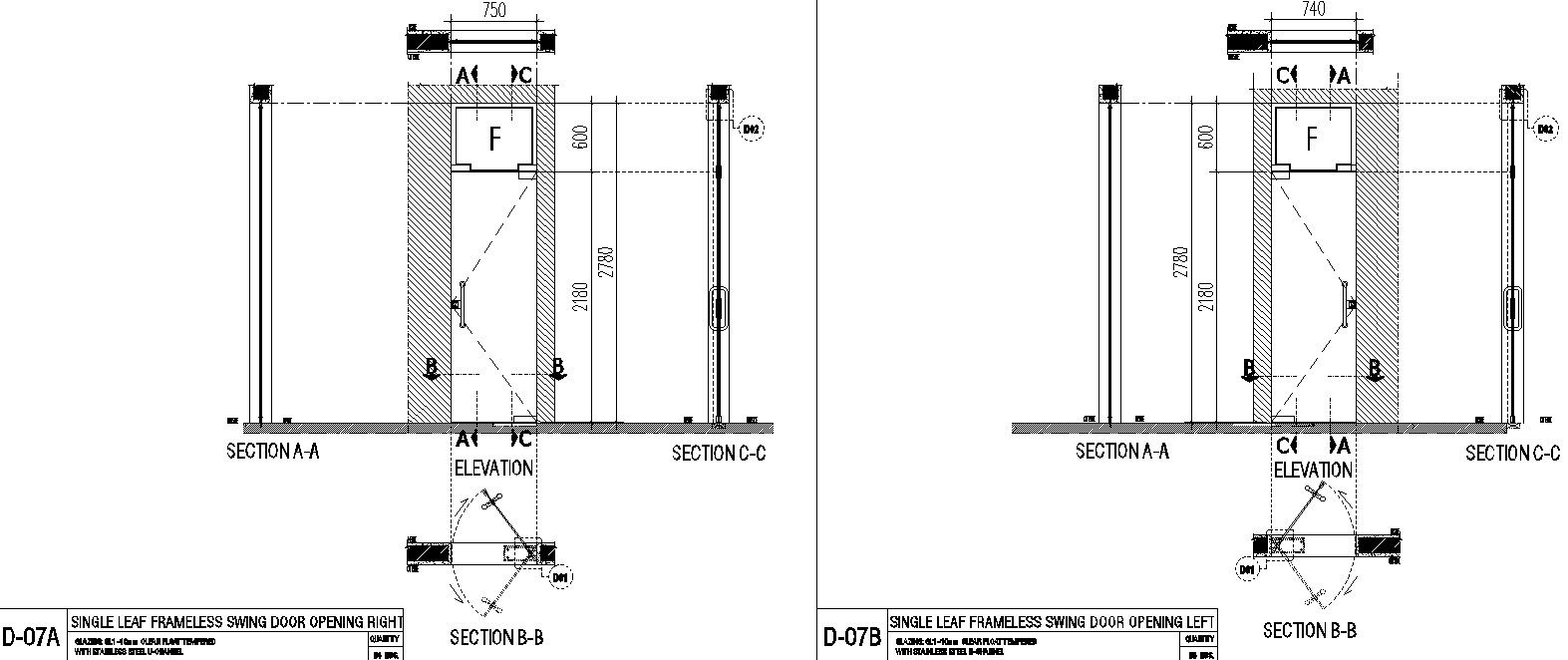 This architectural drawing is Single leaf frameless swing door opening in detail AutoCAD drawing, dwg file, CAD file. In this drawing there were elevation, section AA and section BB is given with details. There were right and left side opening doors are given. For more details and information download the drawing file.