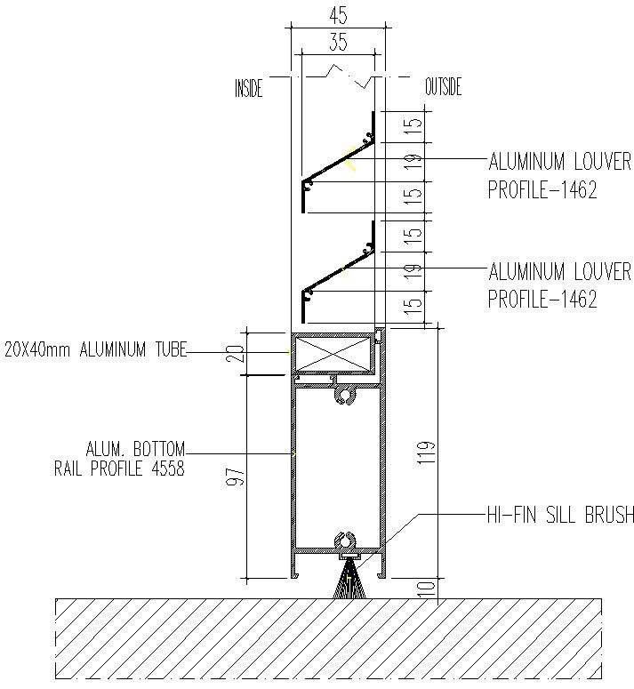This architectural drawing is Detail drawing of mechanical machine in AutoCAD 2D, dwg file, CAD file. In this drawing there were hi-fin sill brush, aluminum louver profile, aluminum tube, aluminum bottom rail profile etc. are given with details. For more details and information download the drawing file.