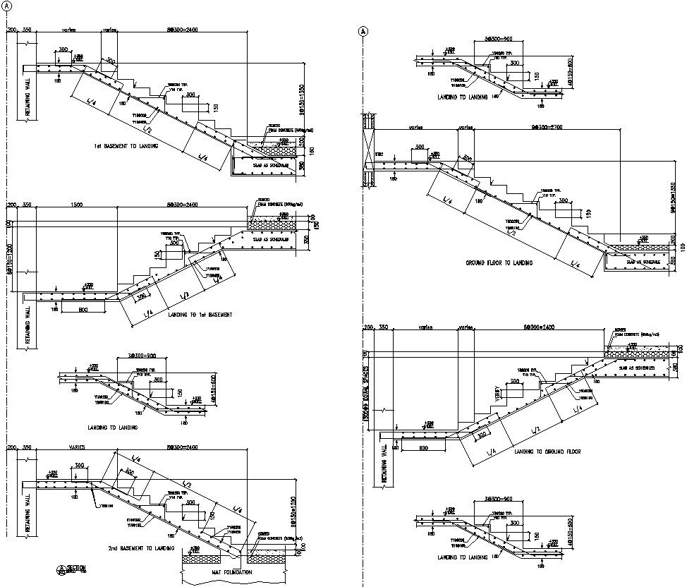 This Architectural Drawing is AutoCAD 2d drawing of Slab details in Stairs section detail drawing in AutoCAD, Dwg files. Calculate the depth of the finished slab, including the concrete and the gravel base. Concrete is typically applied at a minimum of two inches, but I recommend a minimum thickness of 4 inches for a durable stair footing. The waist slab for a staircase is probably more used as a slang not as a professional technical word. This term refers to a slab of the stair that is slanting from the floor slab to the landing slab. This can be imagined like a ramp – not including the steps. For more details and information download the drawing file.