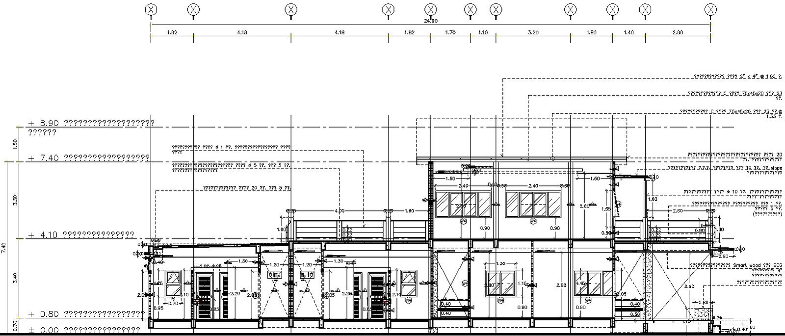 This architectural drawing is Back side elevation of restaurant with detail AutoCAD drawing, CAD file, dwg file. In this drawing there were door section, window section, slab section, railing design, wall section etc. are given with details. There were size of structure is 24x7.40m is given. For more details and information download the drawing file.