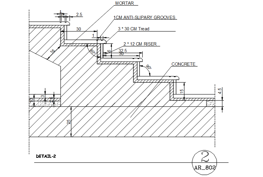 This architectural drawing is Cross section of stair with detail AutoCAD drawing, dwg file, CAD file. In this drawing there were 3x30cm tread, 2x12cm riser, 1cm anti slippery grooves, concrete, mortar section etc. are given with details. For more details and information download the drawing file.