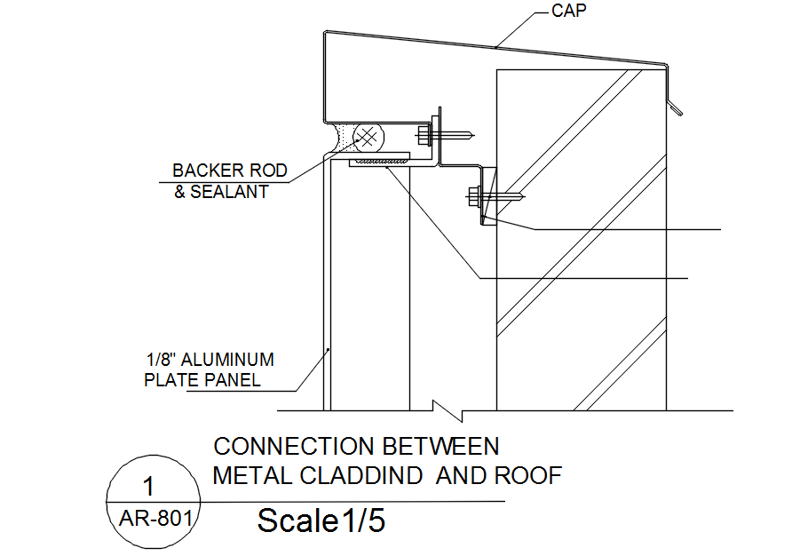 This architectural drawing is Connection between metal cladding and roof in detail AutoCAD drawing, dwg file, CAD file. In this drawing there were backer rod & sealant, 1/8" aluminum plate panel are given with details. For more details and information download the drawing file.