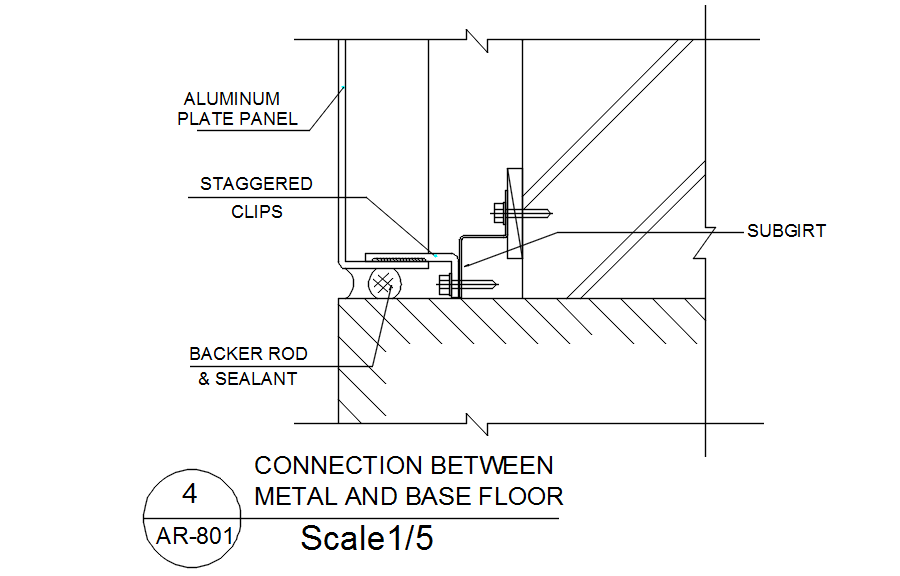 This architectural drawing is Connection between metal and base floor in detail AutoCAD drawing, dwg file, CAD file. In this drawing there were aluminum plate panel, subgirt, staggered clips, backer rod & sealant etc. are given with details. For more details and information download the drawing file.