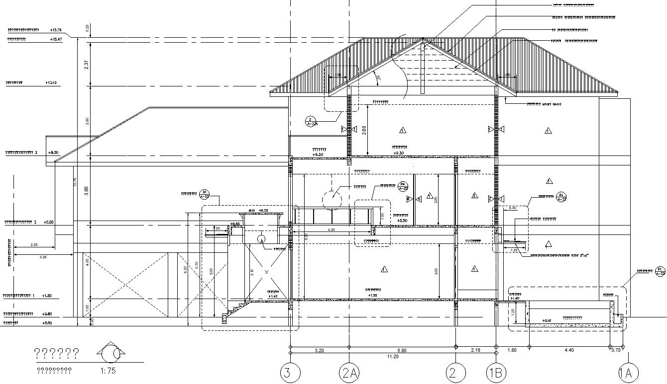 Side sectional elevation of 3 story bungalow with detail dimensions in AutoCAD, dwg file.