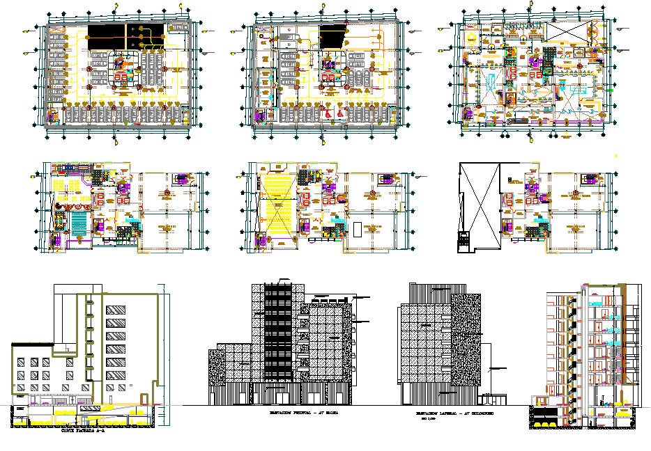 Financial Office Building, architecture layout with detailing, sectional plan, structure plan, sectional elevation of individual floor, exterior elevation.