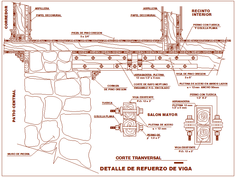Beam detail view with stone wall view dwg file with view of wooden pine piece and stone wall view and nut-bolt view with existing beam view with wooden joint view.