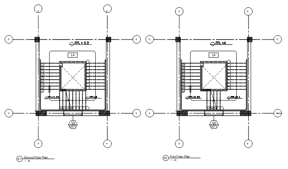 This architectural drawing is Ground floor and first floor staircase plan with detail AutoCAD drawing, CAD file, dwg file. A staircase is one or more flights of stairs leading from one floor to another, and includes landings, newel posts, handrails, balustrades and additional parts. A stairwell is a compartment extending vertically through a building in which stairs are placed. For more details and information download the drawing file.