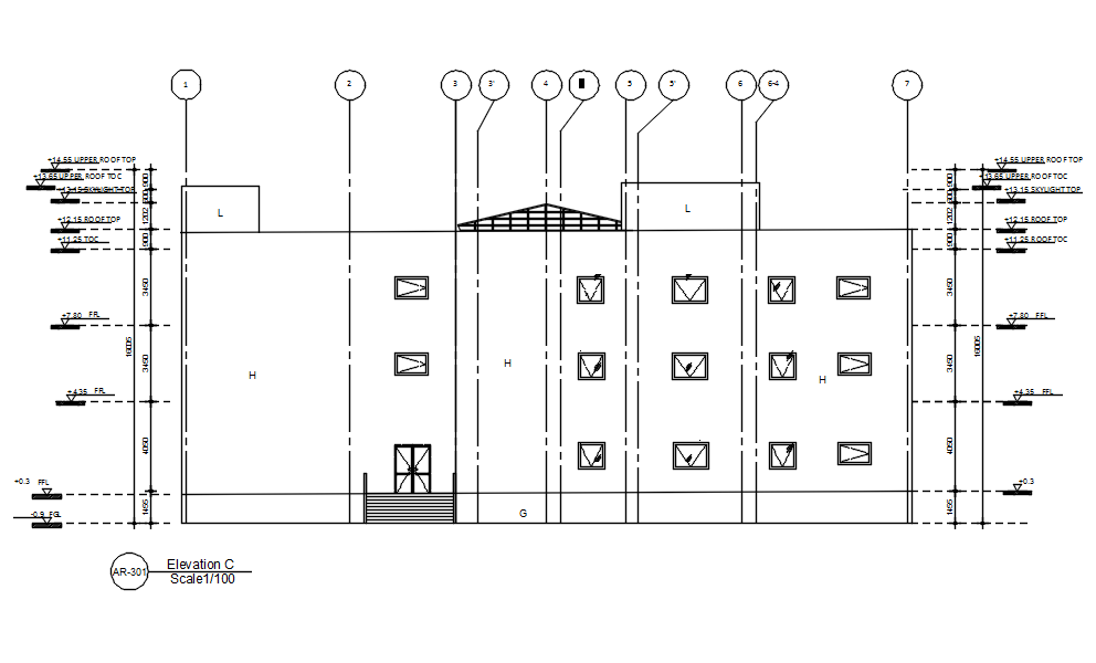 This architectural drawing is Elevation C of G+2 storey building with detail AutoCAD drawing, dwg file, CAD file. In this drawing there were plinth area, door-window section, roof top, upper roof top, skylight top, etc. are given with details. For more details and information download the drawing file.