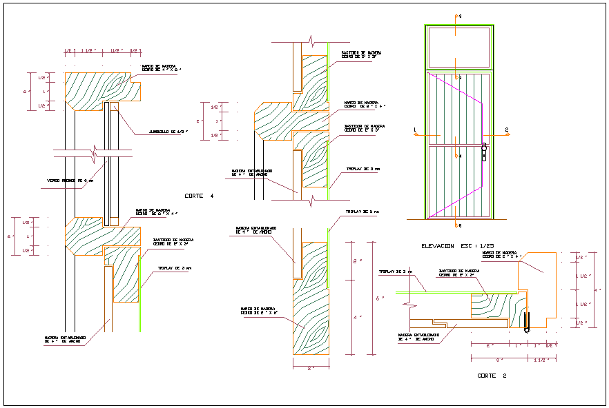 Design view of door with sectional wood detail dwg file with view of door with handle