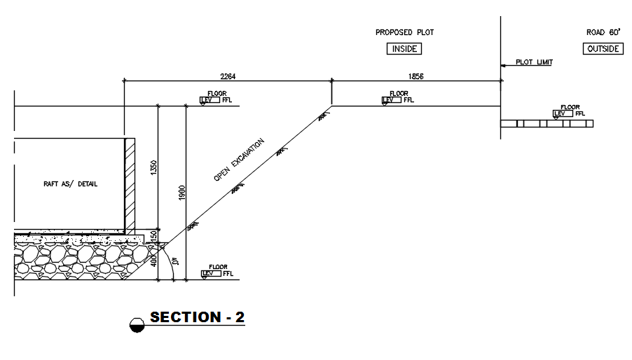 This architectural drawing is Section 2 of foundation with detail AutoCAD drawing, dwg file, CAD file. In this drawing there were plot limit, proposed plot area, floor level, raft foundation detail, open excavation etc. are given with details. For more details and information download the drawing file.