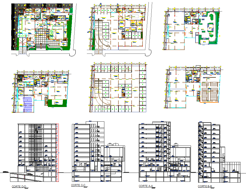Financial Office Building, architecture layout plan with detailing, sectional plan, structure plan, construction plan, exterior elevation.