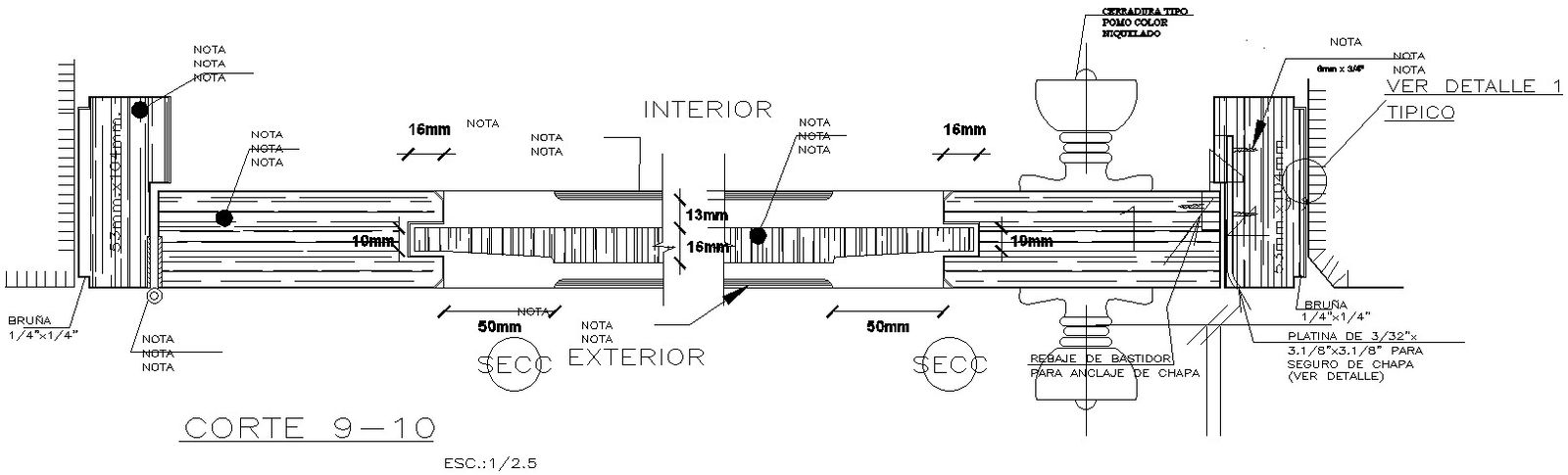 This architectural drawing is Horizontal cut 9-10 of structural member in detail AutoCAD drawing, dwg file, CAD file. In this drawing there were reduction of frame for sheet metal anchorage, Nickle-plated color knob lock, interior and exterior section etc. are given with details. For more details and information download the drawing file.