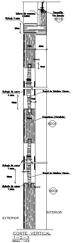 This architectural drawing is Vertical cross section 1-2-3 of structural member in detail AutoCAD drawing, dwg file, CAD file. In this drawing there were Wood Panel 13mm, fence recess 4mm, Lock (Variable), window frame or wall, etc. are given with details. For more details and information download the drawing file.