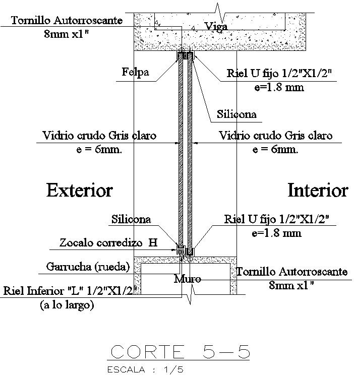 This architectural drawing is Cross section 5-5 of structural member in detail AutoCAD drawing, dwg file, CAD file. In this drawing there were Tapping screw 8mm x1", Sliding plinth, Fixed rail 1/2"X1/2", Wall, Lower Riel "L" 1/2"X1/2", etc. are given with details. For more details and information download the drawing file.