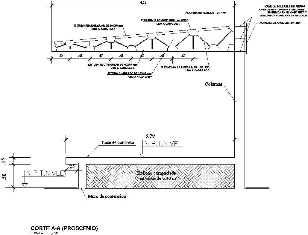 This architectural drawing is Court A-A of Proscenio in detail AutoCAD drawing, dwg file, CAD file. Although it is not necessarily shaped like an arch, proscenium stages feature an architectural frame known as the proscenium arch. Their stages are large and occasionally raked, which refers to a stage that gently slopes upward and away from the audience. On occasion, the stage's front protrudes into the audience past the proscenium. For more details and information download the drawing file.