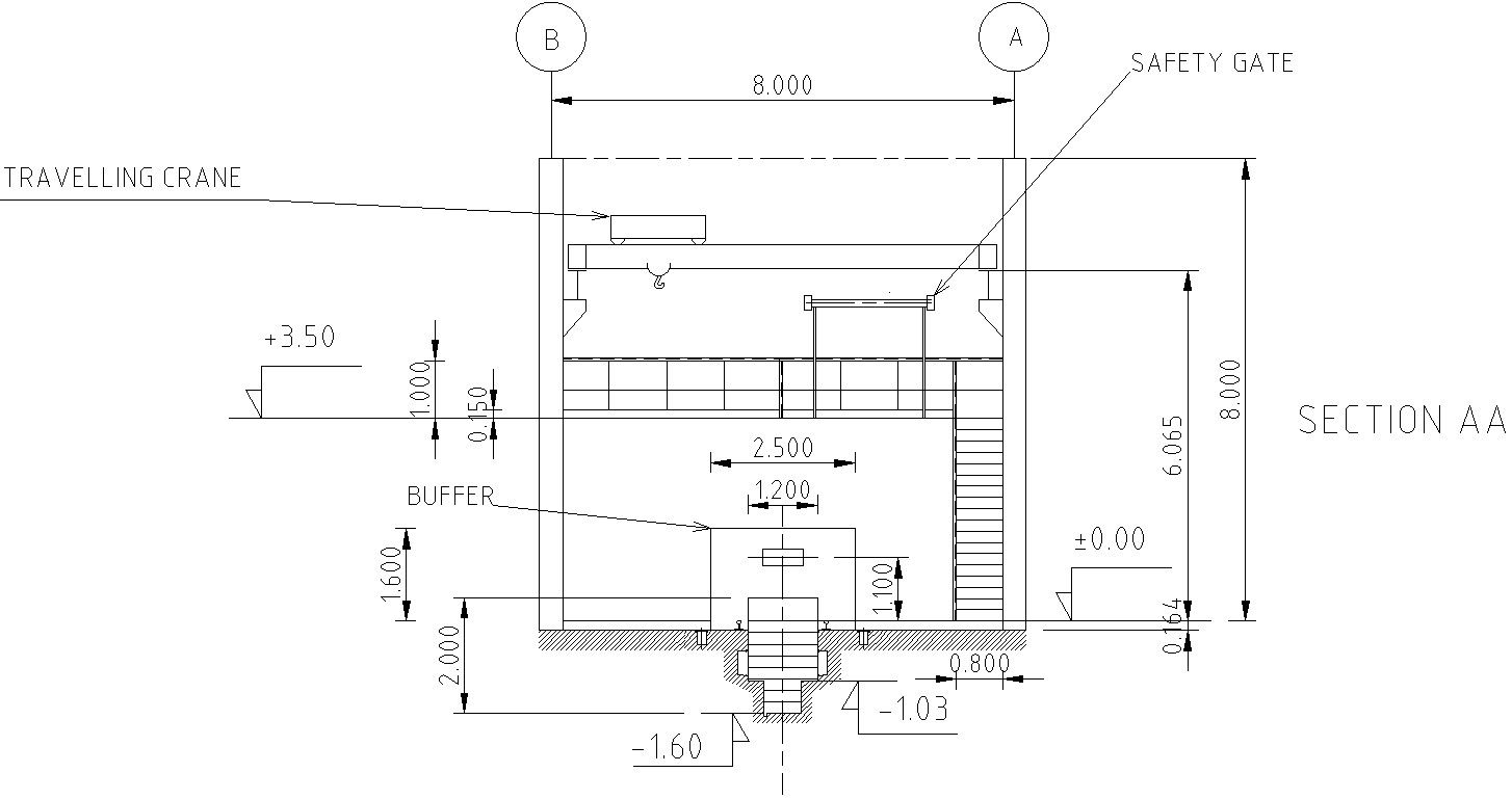 Buffer, travelling crane and safety gate section details of pit in AutoCAD, dwg file.