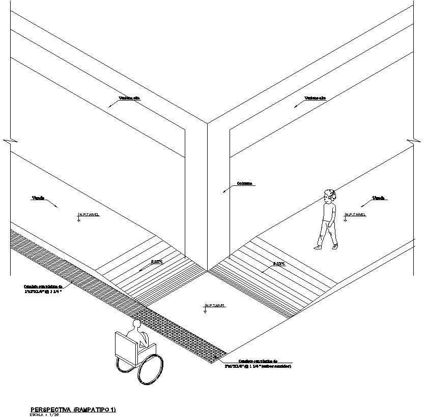 This architectural drawing is PERSPECTIVE view of type 1 ramp with detail AutoCAD drawing, dwg file, CAD file. Ramps are sloping walkways that can be found inside or outside of buildings and are used to give access between floors. For those who use wheelchairs, have mobility challenges, or have prams, bicycles, or other wheeled things, ramps offer an alternative to steps. For more details and information download the drawing file.