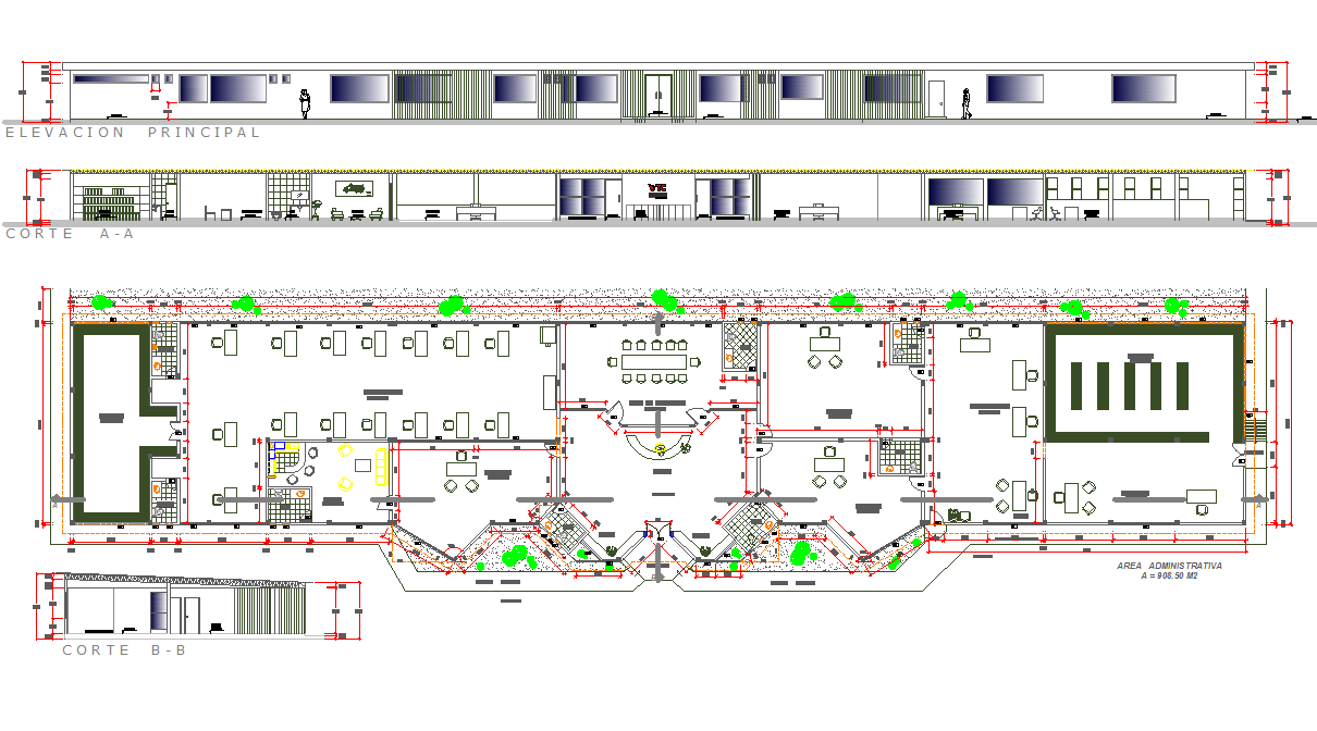 Administrative Office Building, architecture layout with detailing, sectional plan, structure plan, sectional elevation.