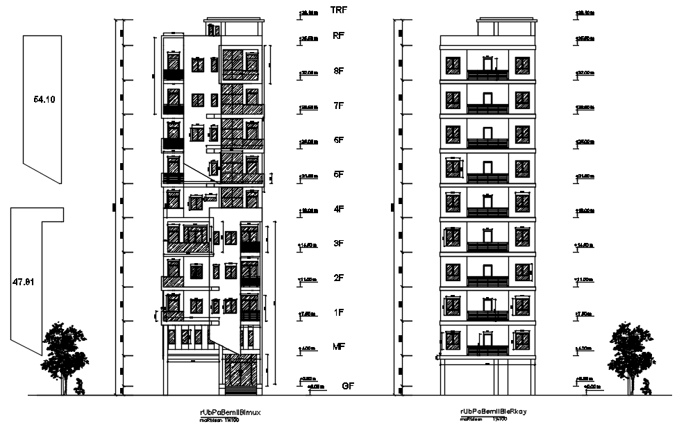 Front elevation of multistory building in detail AutoCAD drawing, dwg file, CAD file