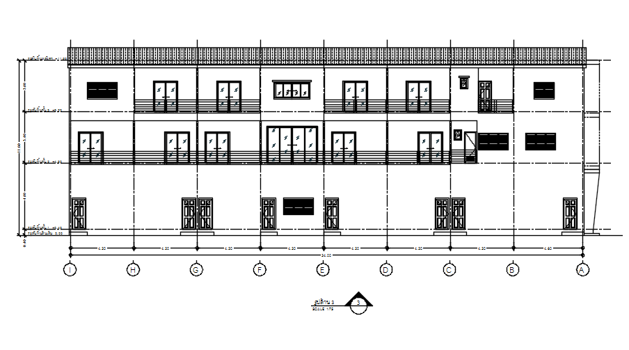 This architectural drawing is Back side elevation of G+2 storey house in detail AutoCAD drawing, dwg file, CAD file. Back elevation: The back of the home, which is typically facing the garden. Eaves are the portions of a roof that overlap or meet the building's walls. The line on a housing design that separates one house from another, including the garden, is known as the property boundary. For more details and information download the drawing file.
