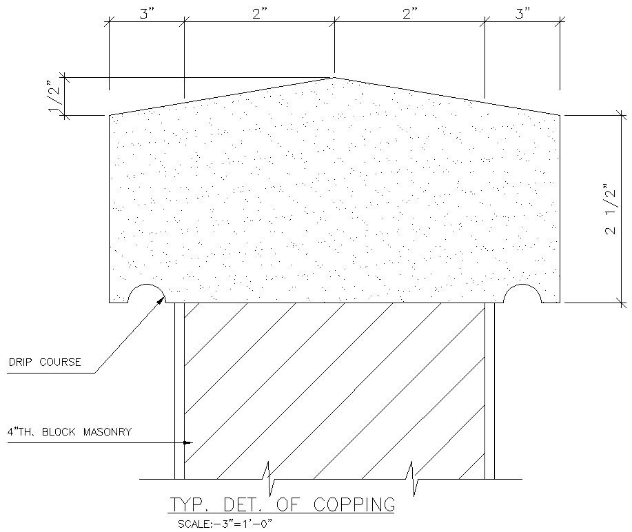 This Architectural Drawing is AutoCAD 2d drawing of Typical detail of copping in AutoCAD, dwg file Coping in construction means covering the exposed top of the roof or wall with a layer of stone, bricks, terracotta, or concrete. Generally, Coping keep the building safe from seepage of water during rainfall and bad weather conditions. It is appropriately weathered and undertakes throating.