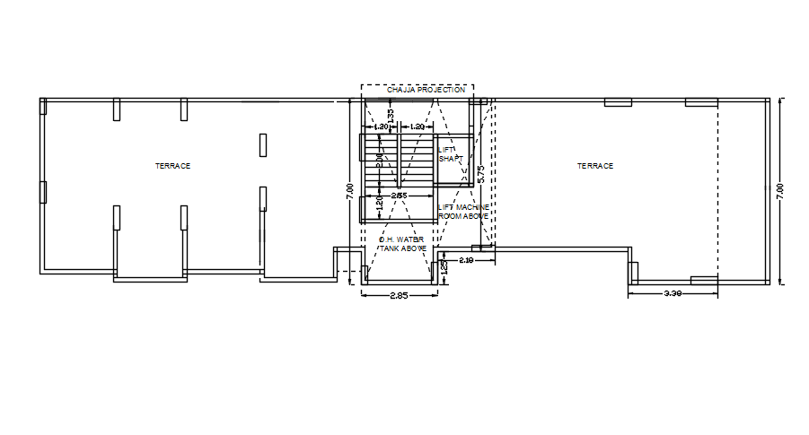 This architectural drawing is Terrace plan of commercial building in detail AutoCAD drawing, dwg file, CAD file. In this drawing there were stair cabin, lift section, overhead water tank, terrace etc. are given with details. For more details and information download the drawing file.