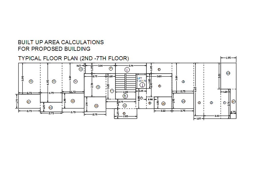 This architectural drawing is Built up area calculation of proposed building in detail AutoCAD drawing, dwg file, CAD file. A building's built-up area is calculated based on the exterior perimeter wall surfaces. It includes the carpet area, the wall thickness, and other inaccessible portions of the flat like the dry balcony, terrace, flower gardens, etc. There is always more than just the carpeted area. For more details and information download the drawing file.