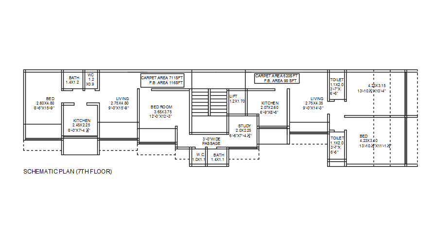 This architectural drawing is Schematic floor plan of 7th floor of commercial building in AutoCAD 2D drawing, dwg file, CAD file. For the goal of promoting residential real estate, schematic floor plans were created. The floor plans include the total floor area calculation in addition to the measurements of individual rooms and representations of property features (GIA). For more details and information download the drawing file.