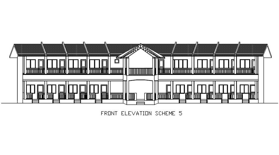 This architectural drawing is Front elevation scheme 5 in detail AutoCAD drawing, CAD file, dwg file. The structure's front side is shown in the front elevation. The architectural drawing is a piece of a larger collection. To demonstrate a two-dimensional image of a building, architects specifically employ elevations. For more details and information download the drawing file.