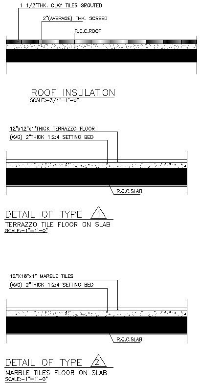 This Architectural Drawing is AutoCAD 2d drawing of Typical Detail of roof insulation and terrazzo tile flooring on slab in AutoCAD, dwg file. Terrazzo tiles must be installed on a well-levelled, clean and dry surface. Humid subsoil will cause fur deposits on the tile's surface. Apply the adhesive evenly on the surface the tile is being laid on, using a large-toothed comb trowel. Also apply adhesive on the back of the tile. For more details and information download the drawing file.