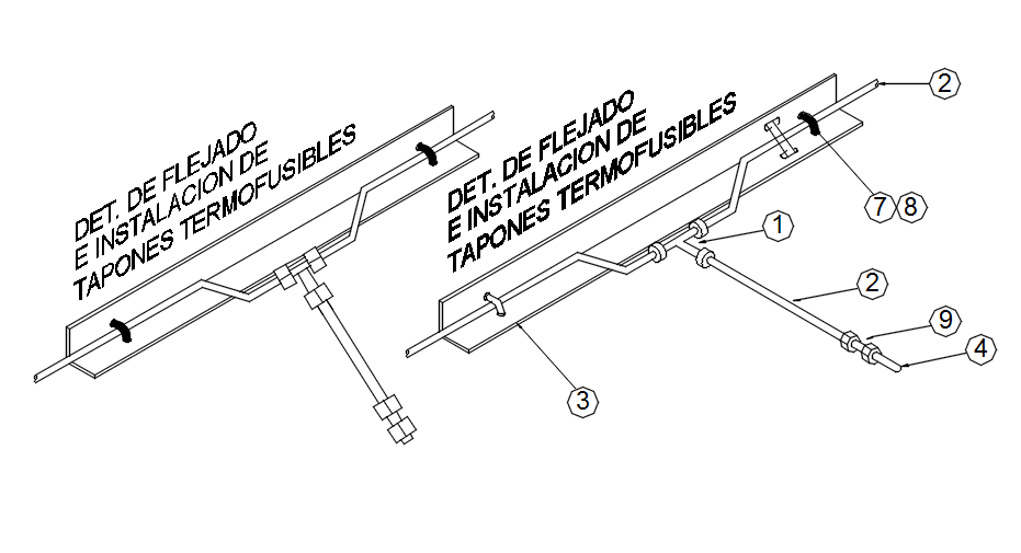 This architectural drawing is DET. STRAPPING AND INSTALLATION OF HOT FUSED PLUGS design in detail AutoCAD drawing, dwg file, CAD file. An electrical circuit is connected to a plug fuse as a safety measure to stop excessive current flow during failures. The fuse element will blow in an overloaded electrical circuit, interrupting and stopping the current flow. For more details and information download the drawing file.