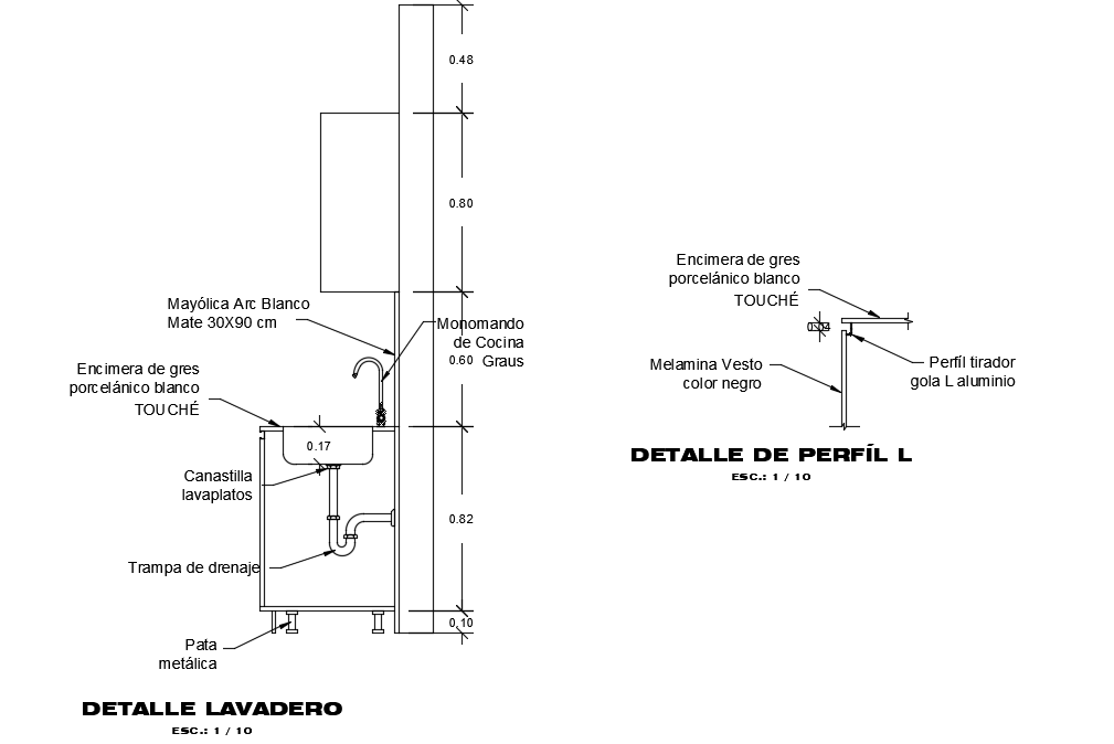 The kitchen lavenderia section detail drawing is given. Here, water flow from top to sink is given. A detailed view of the prefill is given.