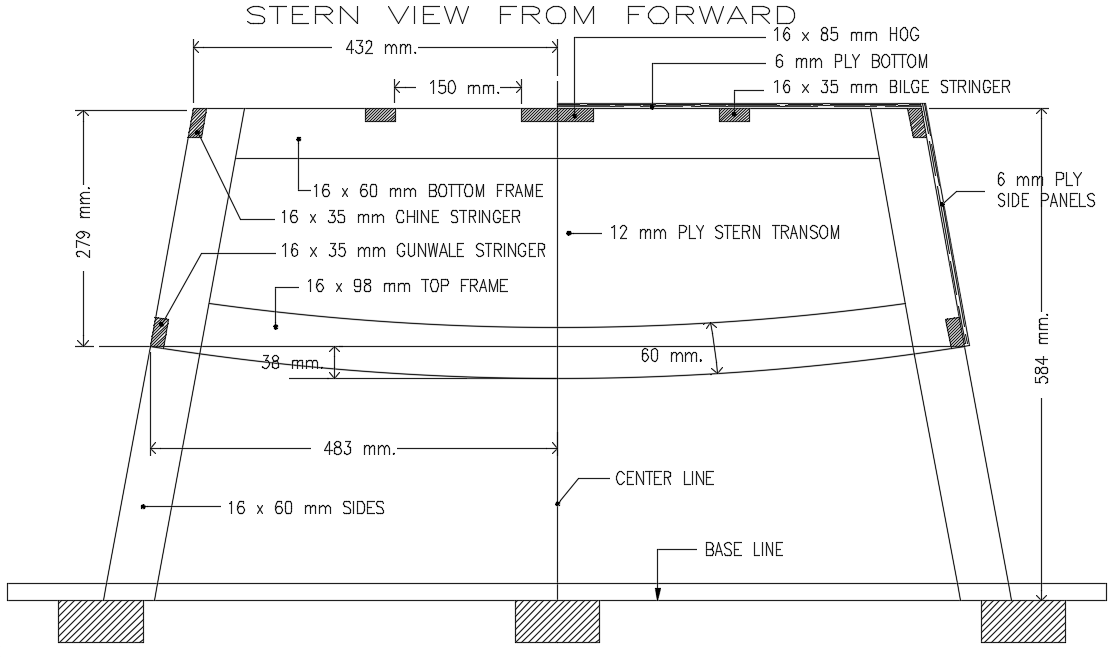 Stern view of sailboat AutoCAD drawing is given in this file. Bottom and top frames are provided. Centerline and baselines are marked. 160x60mm bottom frame, 16x98m top frame, 16x35mm gunwale stringer, 16x35mm chine stringer, 6mm ply bottom, 16x35mm bilge stringer, 16x60mm sides, 6mm ply side panels, and other details are mentioned.