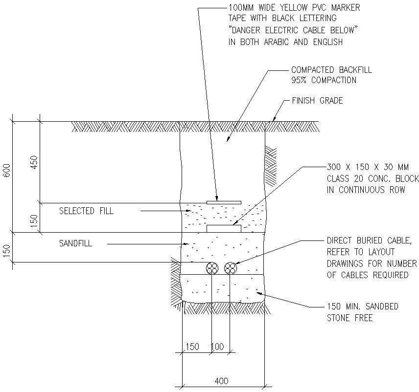 This Architectural Drawin is AutoCAD 2d drawing of Direct buried cable details in AutoCAD, dwg file. Direct-burial cable is a special type of electrical wiring or cable that is designed to be buried in a trench underground. The individual electrical conducting wires inside the cable are encased in a solid thermoplastic sheath that seals out moisture and protects the conducting wires within.
