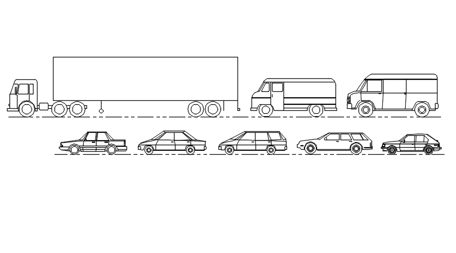 Side view of vehicles in AutoCAD drawing, dwg file, CAD file