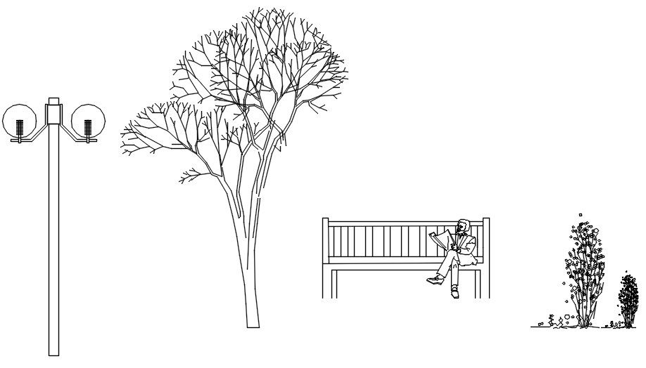 This architectural drawing is Side view of street in detail AutoCAD drawing, dwg file, CAD file. In this drawing there were human seating on the bench, street light pole, trees, plants-shrubs, etc. are given in this file. For more details and information download the drawing file.