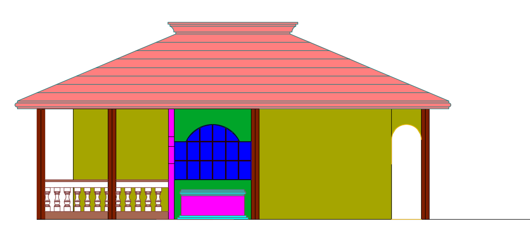 8x16m single story village house building elevation view is given. Here, the traditional roof is provided. 4 pillars are provided in the shape of a circle.