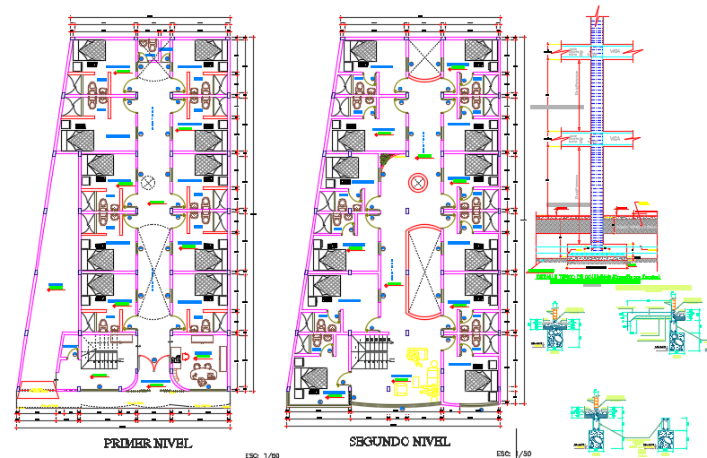 Hostel 2storeys Layout plan dwg file. Find here layout plan along of furniture detailing in autocad format.