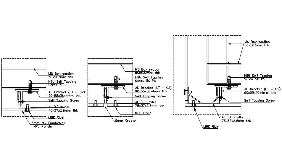 This architectural drawing is Corner joint details of steel strip factory in detail AutoCAD drawing, dwg file, CAD file. In this drawing there were MS Box section, Hilti Self Tapping, Self Tapping Screw, MBE Rivet, 8mm Groove, 6mm thick FunderMax HPL Panels, etc. are given with details. For more details and information download the drawing file.