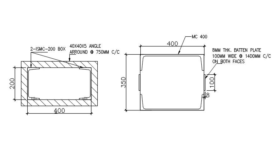 This architectural drawing is Steel angle section design in detail AutoCAD drawing, dwg file, CAD file. In this drawing there were 2-ISMC-200 BOX, 40X40X5 ANGLE ARROUND @ 750MM C/C, 8MM THK. BATTEN PLATE 100MM WIDE @ 1400MM C/C ON BOTH FACES, etc. details are given. For more details and information download the drawing file.
