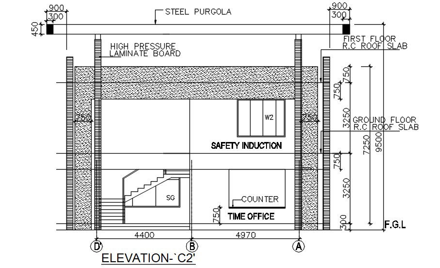 This architectural drawing is Elevation C2 of factory in detail AutoCAD drawing, dwg file, CAD file. In this drawing there were office, safety induction, counter, ground floor & first floor RC roof slab, high pressure laminate board, etc. are given with details. For more details and information download the drawing file.
