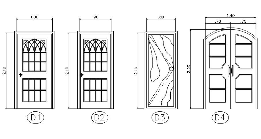 This architectural drawing is Different sizes door design in AutoCAD 2D drawing, dwg file, CAD file. In this drawing there were 1.00x2.10m, 0.90x2.10m, 0.80x2.10m, 1.40x2.20m etc. sizes doors are given. For more details and information download the drawing file.